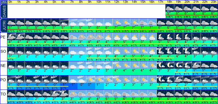 | Ura | 00h | 01h | 02h | 03h | 04h | 05h | 06h | 07h | 08h | 09h | 10h | 11h | 12h | 13h | 14h | 15h | 16h | 17h | 18h | 19h | 20h | 21h | 22h | 23h | |  |  |  |  |  |  |  |  |  |  |  |  |  |  |  |  |  |  |  |  |  |  |  |  | | Temperatura [C°] | 5°C | 5°C | 5°C | 5°C | 5°C | 5°C | 5°C | 5°C | 5°C | 5°C | 6°C | 6°C | 7°C | 7°C | 7°C | 7°C | 7°C | 6°C | 6°C | 6°C | 5°C | 5°C | 5°C | 4°C | | Občutek [C°] | 3°C | 3°C | 3°C | 3°C | 3°C | 3°C | 2°C | 2°C | 3°C | 3°C | 4°C | 4°C | 5°C | 5°C | 5°C | 5°C | 4°C | 4°C | 3°C | 3°C | 3°C | 2°C | 2°C | 2°C | | Možnost padavin | 73 % | 79 % | 73 % | 60 % | 40 % | 40 % | 28 % | 16 % | 9 % | 8 % | 7 % | 8 % | 25 % | 25 % | 25 % | 39 % | 53 % | 46 % | 51 % | 69 % | 61 % | 43 % | 37 % | 37 % | | Količina padavin [mm] | 1 mm | | | | | | | | | | | | | | | | | | | | | 1 mm | 1 mm | 1 mm | Sneg [cm] | | | | | | | | | | | | | | | | | | | | | | | | | | UV index | | | | | | | | | | | | | | | | | | | | | | | | | | Hitrost vetra | 4 km/h | 4 km/h | 4 km/h | 4 km/h | 4 km/h | 4 km/h | 4 km/h | 4 km/h | 4 km/h | 4 km/h | 4 km/h | 4 km/h | 5 km/h | 5 km/h | 6 km/h | 6 km/h | 6 km/h | 6 km/h | 6 km/h | 6 km/h | 6 km/h | 5 km/h | 5 km/h | 5 km/h | Smer vetra | Z | Z | J | S | V | S | Z | S | Z | S | Z | S | S | S | S | S | V | V | V | J | V | J | J | V | | Zračni tlak | 992 | 993 | 993 | 993 | 993 | 994 | 994 | 994 | 995 | 995 | 996 | 996 | 996 | 996 | 997 | 997 | 998 | 999 | 1000 | 1001 | 1001 | 1001 | 1002 | 1002 | | Vlaga | 93 % | 92 % | 92 % | 92 % | 93 % | 93 % | 92 % | 92 % | 91 % | 91 % | 90 % | 88 % | 86 % | 85 % | 84 % | 85 % | 86 % | 87 % | 88 % | 89 % | 89 % | 89 % | 89 % | 89 % |
